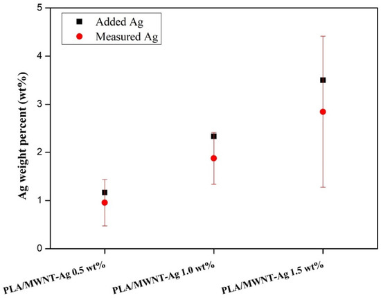 Quantitative analysis was conducted with the same samples in order to measure the degree of dispersion more precisely. In Figure 6, the black dot indicates the weight percentage of Ag added to the PLA matrix, while the red dot represents that of Ag measured by the EPMA equipment. The measured weight percentage of Ag is slightly lower than the added Ag weight percentage. The reason may be that there still exist some aggregation parts of MWNT-Ag after 24 h sonication. Additionally, the relatively wide range of standard deviations is due to more nanoparticle aggregation.