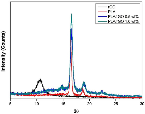 The XRD patterns of pure rGO, pure PLA, PLA/rGO 0.5 wt%, and PLA/rGO 1.0 wt% are shown in Figure 7. Pure PLA exhibits two sharp peaks at 2θ = 16.58° and 18.95°, which reflects crystal planes (200)/(110) and (203) indicating α- and α’- crystal formation. These results are in accordance with the results of a study by Kalani and Yunus [39]. As can be seen in Figure 7, there is a strong peak around 10.63°, which corresponds to the rGO structure. However, the peak associated with rGO disappeared for the PLA/rGO 0.5 wt% and PLA/rGO 1.0 wt% samples. It could be inferred that rGO was evenly dispersed in the PLA matrix. Meanwhile, the peaks around 16.58° and 18.95° for the PLA/rGO samples were more prominent than those of pure PLA, indicating more crystallinity owing to the rGO acting as a nucleating agent.