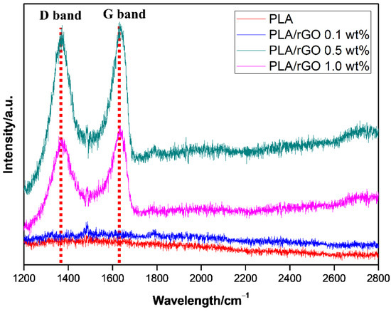 The Raman spectra of PLA/rGO 0.5 wt% and PLA/rGO 1.0 wt% are shown in Figure 8. The intensity of the D band (around 1400 cm−1) and G band (around 1600 cm−1) corresponded to the vibrations of the sp3-bonded carbon atoms and sp2-bonded carbon atoms, respectively. As already known, the D band reflects disordered structures (such as defects, crystal boundaries, and so on), while the G band reflects the crystalline structures [40]. The intensity ratios of the D band and G band (ID/IG) for PLA/rGO 0.5 wt% and PLA/rGO 1.0 wt% were 0.93 and 0.99, respectively, which were significantly higher than that of pure graphite [41], because GO was successfully exfoliated after reduction. In addition, there was no 2D band between 2600 cm−1 and 2800 cm−1, indicating no stacked graphene layers.