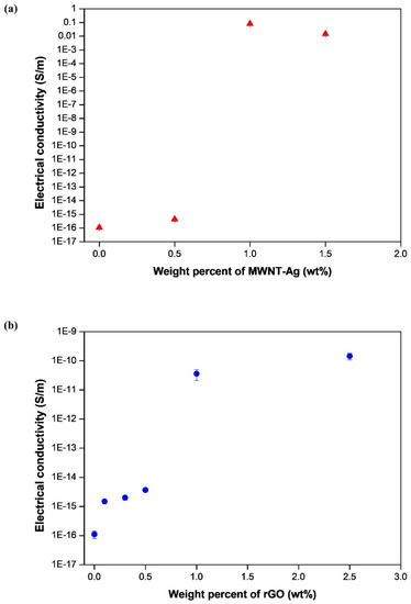 The electrical properties were analyzed for different concentrations of MWNT-Ag and/or rGO (Figure 9). The results showed that the electrical conductivity of PLA/MWNT-Ag and PLA/GO increased as the concentration of nanoparticles increased. PLA films with more than 1.0 wt% nanoparticles showed significantly higher electrical conductivities than pure PLA and PLA films with less than 0.5wt% nanoparticles. In addition, the electrical conductivity of PLA/MWNT-Ag 1.0wt%, which exhibited the best dispersion, was shown to be remarkably higher than that of pure PLA and other PLA films. Finally, PLA/MWNT-Ag films showed much higher electrical conductivities than PLA/rGO films for the same nanoparticle concentration. Ag nanoparticles also contributed greatly to enhancing the electrical conductivity of the samples; therefore, relatively higher electrical conductivities were observed with PLA/MWNT-Ag films.