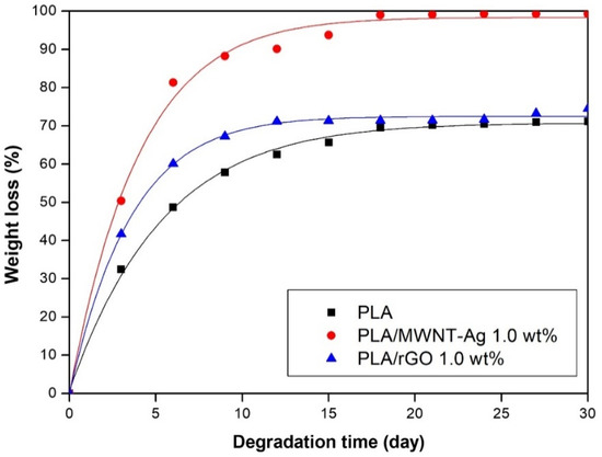 The weight losses of pure PLA, PLA/MWNT-Ag, and PLA/rGO with degradation time are shown in Figure 10. The weight losses of all samples exceeded 50% within 10 days, and then, the degradation rate was decreased. The degradation rates of PLA/MWNT-Ag and PLA/rGO were higher than that of pure PLA because of the interface between the particles and the PLA matrix, which served as a leading path for hydrolytic degradation. In this study, the same weight percentage of MWNT and rGO were used in the PLA matrix. However, the Ag nanoparticles were grafted on MWNT; thus, the total weight percentage of the nanoparticles for the PLA/MWNT-Ag was higher than that of PLA/rGO. It means that the surface areas of the interfaces of PLA/MWNT-Ag were much larger than that of PLA/rGO. Therefore, the degradation rate of PLA/MWNT-Ag was higher than that of PLA/rGO. Another perspective of the above phenomenon was that increasing the crystallinity of the samples was attributed to making it more difficult to degrade parts than the amorphous parts for the PLA/rGO films prepared at 60 ℃. Therefore, the degradation rate of PLA/rGO decreases compared to that of PLA/MWNT-Ag. These observed tendencies were identical to those of our previous study [42].