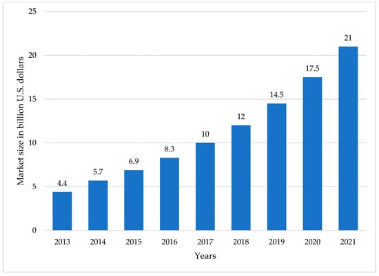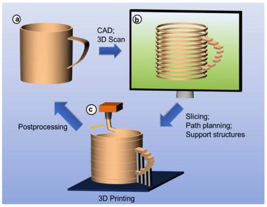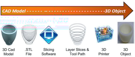 The 3D printing process started by developing an object model in 3D form by using CAD software or reverse engineering technique using a 3D scanner to scan the finished products. The 3D software cross-sectionally cuts the layers of the model, and then transfers a file from the computer to the printer. Then, the printer creates layers of objects through the selective placement of material. The process is the same as the working principle of an inkjet printer that goes front and back over the page to add layers of material on the upper parts of each other until the objects are obtained []. There are three main steps in the 3D printing process which are modeling, printing, and finishing (Figure 1). The popularity of the 3D printer has continued to grow due to the development of 3D modeling technologies and techniques [] (Figure 2). The global 3D printing market size was valued at 14.5 billion USD in 2019 and is expected to expand at a CAGR exceeding 14% from 2020 to 2027, according to Grand View Research’s latest report []. In addition, 3D printing and related technologies have evolved continuously in line with the intensive R&D activities undertaken and the aggressive investments made by private and public sectors. Government funding and encouraging initiatives offered in developing economies have prompted manufacturers to pursue improvements in technology and the adoption of new technologies.
