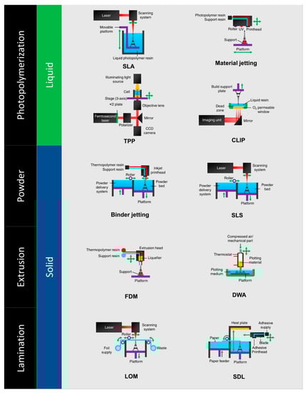 There are several types of 3D printing machines available that are used in the manufacturing field (Figure 3). All of the machines can be differentiated based on their technology []. Printers have been developed based on suitability for the material to be printed and some of them are namely: fused deposition modeling (FDM), laminated object manufacturing (LOM), digital light processing (DLP), stereolithography (SLA), selective laser melting (SLM), selective laser sintering (SLS), electronic beam melting (EBM), binder jetting (BJ), and material jetting (MJ) [].