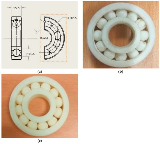 (a) 2D drawing of the assembly (dimensions in mm) and 3D-printed bearing using (b) Nylon 66 and (c) ABS (adapted with permission from reference []).