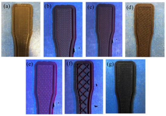 3D-printed samples with different infill patterns: (a) Linear; (b) hexagonal; (c) moroccanstar; (d) catfill; (e) sharkfill; (f) diamond; (g) Hilbert (adapted with permission from reference []).