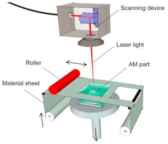 Laminated object manufacturing (LOM) is a process to build an object by combining subtractive and additive techniques (Figure 9). The process binds several layer sheets of material, one on top of another using pressure, adhesive, and heat. After the binding process is completed, the product is cut using a laser, a knife, or can be further modified using machine drilling []. This technique is one of the high-speed prototype technologies used for creating 3D solids with a lamination process. The only characteristic of this technology is its ability to produce complex geometric components at lower production and operating costs. The LOM method was investigated by several researchers from the 1980s and produced promising results. The major aim of this study was to demonstrate the overall idea and operating principle of LOM and to examine the available paper, composite, and metal technologies [].