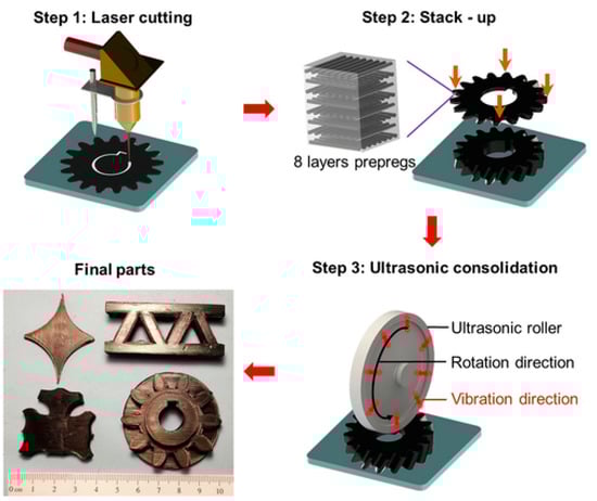 Chang et al. [] focused on the AM of continuous fiber-reinforced thermoplastic composites (CFRTPCs), which can produce innovative lightweight components with high durability at a relatively low cost. A new methodology for CFRTPC production was based on the new method of prepreg carbon fiber sheets, i.e., the manufacture of ultrasonic-assisted LOM, as shown in Figure 10. Prepreg sheets were initially cut in 2D form, followed by using an ultrasound vibration roller to consolidate every eight sheets in order to efficiently manufacture 3D composite components. Next, the additives were subjected to a hot press to further improve their mechanical properties. High tensile strength and tensile modulus of 1760 MPa and 106 GPa, respectively, were present in the unidirectional composite samples. The hot-pressed AM composite pieces have been used by the prepreg manufacturing process using typical production processes to determine mechanical characteristics. In general, there are tremendous potential applications in the aerospace and transportation industries for the suggested CFRTPC AM technique.