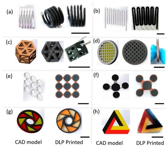 According to specified CAD models, various varieties of DLP 3D-printed conductive structures using MWCNT nanocomposite and immaculate resins. For printed items, the scale bar is 10 mm (adapted with permission from reference []).