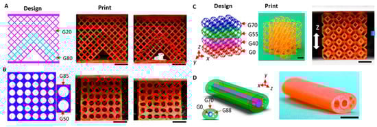 Design and print of graded metamaterial via g-DLP for multifunctional applications, including 2D lattice and cellular metamaterial for: (A) Controlled buckling; (B) pattern transformation; (C) 3D lattice metamaterial; (D) the design and print part of a limb-mimic structure. Scale bars, 1 cm. (Adapted with permission from reference []).