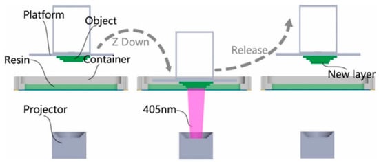 The technology of 3D printing has gained significant research interest recently for directly manufacturing 3D components and structures for use in a variety of applications. Digital light processing (DLP) is a process to cure liquid resin to form 3D products using a digital micromirror device as a power source projector (Figure 12). DLP also uses light polymerization, which is almost the same method for stereolithography (SLA). In addition, DLP is a faster printing process, can produce objects with a higher resolution, and the thickness of the layer can be less than 30 microns [].