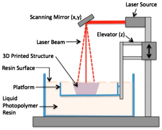 The DLP and SLA technologies are very similar, as they are both classified as additive manufacturing (AM) technologies by the American Section of the International Association for Testing Materials (ASTM). Nonetheless, SLA is the oldest 3D printing technology that is still being used today. Unlike DLP, the SLA 3D printer uses a laser beam to harden the polymer. Particularly, SLA uses a focused laser beam to scan the surface of each layer and provide the energy for polymerization (as shown in Figure 16), whereas DLP uses UV light from a projector. In addition, the laser beam of SLA moves from point to point tracing the geometry, while in DLP, the UV light source is stationary and cures the entire resin layer at once. As compared with DLP 3D printing, SLA 3D printing is more accurate and has better print quality because the resin is cured (hardened) from point to point.