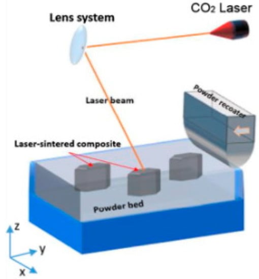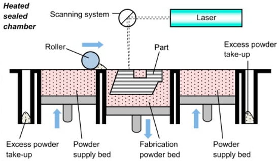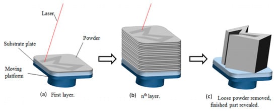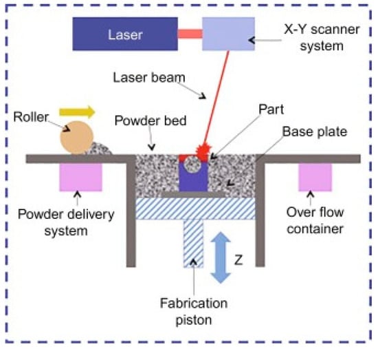 Selective laser melting (SLM) can produce high-precision, full-density, functional metal parts (Figure 17). The powder deposition method has been used in SLM that involves a coating mechanism to deposit a layer of powder onto the substrate plate and a powder reservoir. SLM technology can produce complicated metal parts using layer-by-layer melting with any geometry and joining of powder materials based on the CAD model from the computer. The powder particles are fused during the process, followed by solidification [].