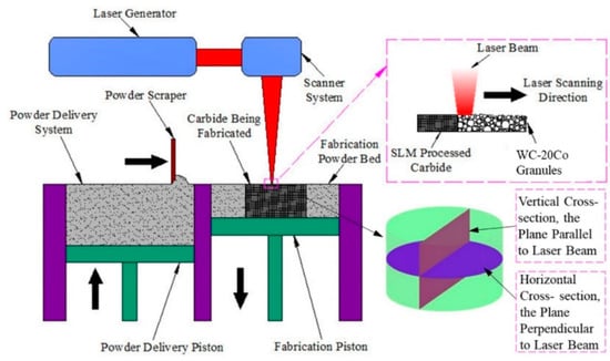Schematic design of the SLM approach. On both the vertical (parallel to the laser beam) and horizontal (perpendicular to the laser beam) cross-sections of the SLM-treated carbides, microstructural analysis and hardness tests were performed (adapted with permission from reference []).