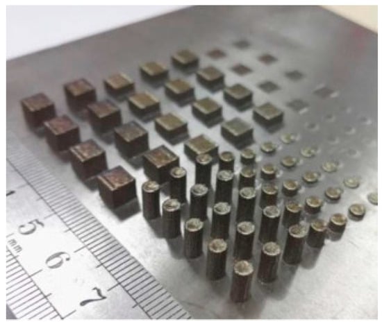Three-dimensional printing of crack-free bulk metallic glasses remains to be a challenge due to their intrinsic brittleness and the generation of huge thermal stress during the selective laser melting. The selective laser melting process included the Zr55Cu30Ni5Al10 system and 3D printing, which is shown in Figure 21. There was evidence of a considerable (approximately 83%) portion of an amorphous phase of bulk metallic glassy composite and the successful production of small fragments of intermetallic compounds free from cracks. The strength of the 3D-printed metallic glassy composite was over 1500 MPa. A finite-element simulation revealed the mechanism of crystallization in heat-affected zones, demonstrating that low thermal stress reduced the probability of micro-crack formation and fracture toughness was important in crack suppression during the selective laser melting process [].