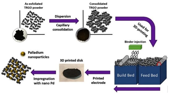 Luong et al. [] produced 3D laser-induced graphene (LIG) foams by producing layers of LIG by irradiating polyimide (PI) sheets, as illustrated in Figure 11. The PI to LIG conversion has been well described. To begin, layers of PI are irradiated to embed LIG into and atop a PI film. One of the layers serves as the GF’s foundation or basis. Then, the layers are layered on top of one another after being sprayed with ethylene glycol (EG). A laser-milling subtractive method is also created and illustrated here to further improve the 3D constructions. Various 3D graphene items are produced using a combination of both processes. Then, the sandwiched layers are lased, fusing the LIG sheets together, and this procedure is repeated to create macroscale LIG foams. The printed foam is dried in the environment at 200 °C to evaporate the leftover EG once the procedure is completed to the appropriate height. The LIG foams have high mechanical conductivity and are suitable for a variety of energy storage and electrical sensor applications [].