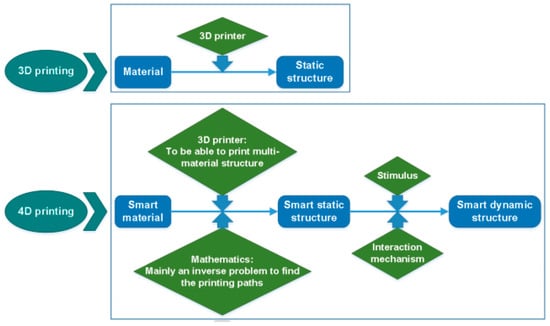 Daminabo et al. [] indicated that, while additive production (AM) technology has developed remarkably so far, there is still a significantly smaller range of printable and functional material systems that meets the needs of a wide range of industries, including healthcare, manufacture, packaging, aerospace, and the automobile industry. Furthermore, the increasing need for sustainable development has directed attention to extrusion-based technologies (fused deposition models and direct ink writes) because of their scalability, cost effectiveness, and processability of a wider variety of materials, as demonstrated in Figure 5. The authors then identify the new materials and current research efforts that can assist the development of functional/multifunctional (4D) components and products based on extrusion technologies in a sustained and sustainable way.