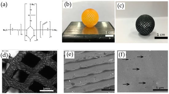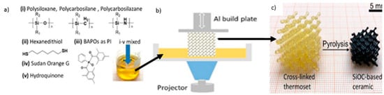 - Wang, X.; Schmidt, F.; Hanaor, D.; Kamm, P.H.; Li, S.; Gurlo, A. Additive manufacturing of ceramics from preceramic polymers: A versatile stereolithographic approach assisted by thiol-ene click chemistry. Addit. Manuf. 2019, 27, 80–90. [Google Scholar] [CrossRef] [Green Version]