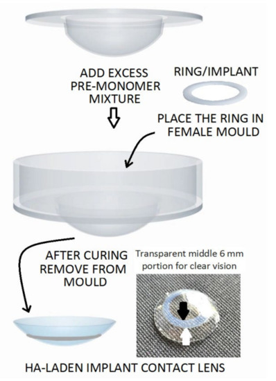 Reports in the literature have provided new methods of delivery by novel contact lenses (Supplementary Table S4). Maulvi et al. (2017) fabricated a hyaluronic acid (HA)-laden ring that was proposed for an implantable contact lens. This device was made via a modified cast-molding technique to avoid critical alterations in the properties of the contact lens. The contact lens was aimed at increasing the usage time for the ocular residence of HA while facilitating a sustained ocular delivery for DES treatment (Figure 3). An in vivo pharmacokinetic evaluation was performed using rabbit tear fluid, and the results demonstrated a controlled HA release over the course of 15 days [112].