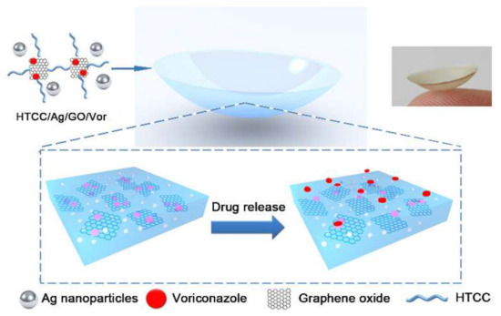 Mun et al. (2019) developed a micelle-embedded contact lens with cholesterol–hyaluronate (C–HA) to extend the time of drug delivery and provide an efficient hydrophobic drug loading. The fabrication of the contact lens was conducted through HEMA via the cross-linker EGDMA. The integrated C–HA micelle contact lens not only continued the optical transmittance, but also represented an excellent improvement of 77.55° in the wettability. Additionally, in vitro tests for drug delivery of cyclosporine showed an organized delivery for more than 12 days [113]. In a different study, Huang et al. (2016) presented a contact lens based on hybrid hydrogel, where they integrated silver nanoparticles, quaternized chitosan, and graphene oxide (GO) charged with an antifungal and antibacterial blend within its structure. The contact lens delivered Voriconazole (Vor), an antifungal component, and improved its continuous delivery from the hydrogel network and maintained the drug release. The contact lens was tested in vitro and in vivo and exhibited acceptable antimicrobial functions (Figure 4).