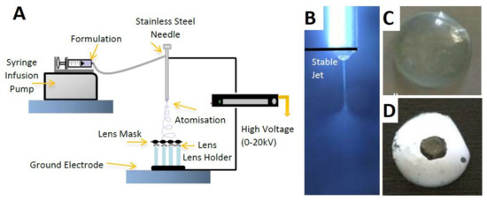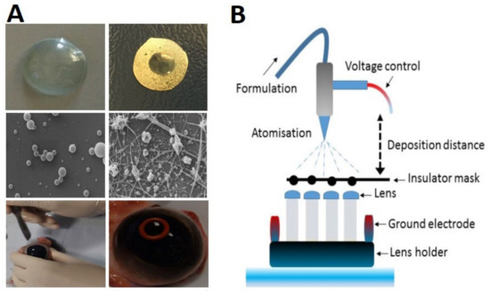 Schematic illustration of ocular lens coating. (A) Digital images of an uncoated and densely coated lens; (B) EHDA coating process. Reprinted with permission from Mehta et al. (2017). Copyright 2017 Elsevier, International Journal of Pharmaceutics.