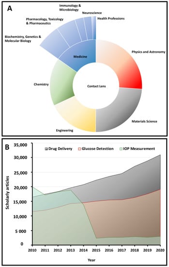 Contact lenses have recently emerged as intelligent health monitoring devices and have been widely utilized in various fields, such as (i) biochemistry and molecular biology, (ii) pharmacology and toxicology, (iii) immunology and microbiology, (iv) neuroscience, and (v) healthcare professions. Scheme 1A presents a summary of the statistics on the usage of contact lenses in different research fields, with specific emphasis on the area of medicine. In particular, within the last two decades, contact lenses have found a unique place in the area of biosensing for continuous intraocular pressure (IOP) measurement and monitoring, as well as glucose detection. Contact lenses have also shown great potential as effective ocular drug delivery systems in the treatment of several ocular diseases, including dry eye syndrome (DES), fungal keratitis, and glaucoma, among others [1,2,3,4,5,6]. Scheme 1B demonstrates the evolution of the scholarly reports on medical contact lenses in the context of their three main applications, which are also the focus of this review article. These smart devices replace invasive and/or minimally invasive methods of monitoring and treatment of ocular disorders. Hybrid contact lenses incorporate rigid segments that are mounted onto soft lenses that offer comfort and enhanced optical features [7]. While a vast majority of these smart contact lenses are aimed at monitoring IOP changes in the eye over a stretched time period, the interest in this area has dramatically decreased (Scheme 1B) over the last 15 years due to the challenges that these systems pose for this specific purpose (thoroughly discussed in Section 5).