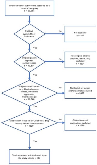 Moreover, we limited our analysis to research articles only and excluded white papers, books and book chapters. Additionally, we narrowed down the application area to IOP measurement, diabetes, drug delivery, and colorblindness. Another applied filter sieved the articles to only consider those that involved human and/or animal studies. As a result, a total of 134 papers were included in this meta-analysis.