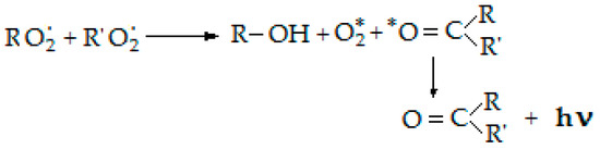 For the evaluation of oxidation degrees two investigation techniques of chemiluminescence were applied. A chemiluminescence spectrometer (LUMIPOL 3–Slovak Academy of Science, Bratislava) was used to characterize the progress of oxidation by isothermal and non-isothermal measurements [33]. The basic process by which the photon is emitted is presented in the following scheme, in Figure 2.
