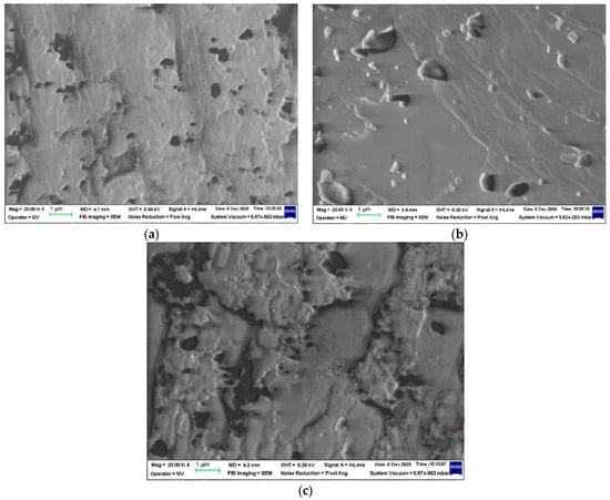 SEM images of Ov-POSS al various radiation processing doses. (a) 0 kGy; (b) 25 kGy; (c) 50 kGy. Magnification 20,000.