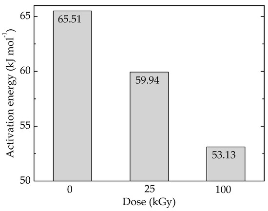 For the characterization of the evolution of crosslinking by the values of P(x)/Q(x), the ratio between the scission radiochemical yield, P(x), and crosslinking radiochemical yield, Q(x), and the insoluble fractions (p) figures were converted into sol fraction, S, by their abstraction from unity. From the application of Charlesby-Pinner relationship (Equation (3)) [35], the intercept of linear dependence provides the expected ratio, where q0, U2,0, and D are initial crosslinking density, initial degree of polymerization, and irradiation dose (kGy), respectively.