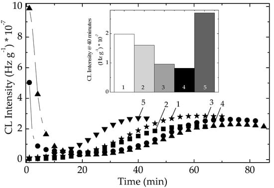 For the evaluation of faith degree for the experimental measurements, i.e., the CL intensity versus temperature, five experiments for the inflexion point of the oxidation (an illustrative kinetic parameter for the evaluation of polymer degradation by chemiluminescence assay during the degradation of neat polymer at 150 °C) were done. The found values expressed in °C were: 171, 172, 168, 166, 172. The standard deviation was σ = 3.1.