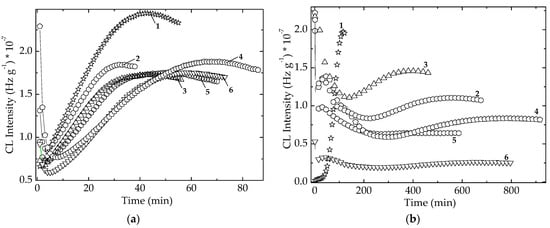 Comparative illustration of the isothermal CL spectra recorded on the unirradiated EPDM samples containing algal extracts and POSS. (a) Spirulina platensis; (b) Chlorella vulgaris. Dose: 0 kGy; Testing temperature: 170 °C. (1) POSS + algal extract; (2) algal extract.