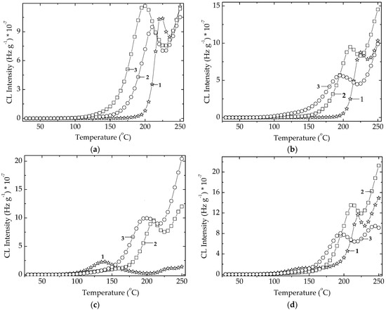 Non-isothermal CL spectra recorded on microalgal powders at three irradiated doses. (a) Chlorella vulgaris; (b) Spirulina platensis. (1) 0 kGy; (2) 25 kGy; (3) 100 kGy. Heating rate: 10 °C min−1.