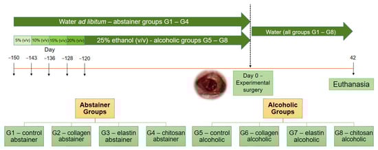 Study design timeline: 40 rats were divided into eight groups of 5 animals each. Twenty animals received tap water (abstainer groups G1 to G4) and twenty animals were submitted to experimental alcoholism with 25% ethanol (alcoholic groups G5 to G8), with previous gradual adaptation to increasing alcohol concentrations (−150 to −120 days). After 1 month of adaptation to experimental alcoholism, the concentration of 25% was maintained for an additional 4 months in groups G5 to G8. On day 0, all animals of the eight groups underwent surgery for the creation of an experimental nasal bone defect. The bone defect was filled with clot in G1 and G5, with collagen membrane in G2 and G6, with elastin membrane in G3 and G7, and with chitosan membrane in G4 and G8. After surgery, all animals continued to receive tap water and were euthanized at 42 days post-surgery.