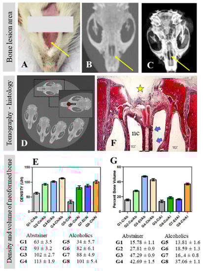 Regardless of liquid diet (abstainer or alcoholics), animals that received chitosan grafts had the best quantitative results of bone density (expressed in Hounsfield units—HU) in the bone region of interest, with 113 ± 1.9 in abstainer (G4—Ch/Ab) and 101 ± 5.4 in alcoholics (Ch/Al) (Figure 2E). In relation to the neoformed bone volume, evaluated histologically in the bone defect area, chitosan also obtained good results, being the one with the highest formation in alcoholic animals (G8—Ch/Al; 37.06 ± 1.1) and the second highest in the bone formation of abstainers (G4—Ch/Ab; 42.69 ± 1.5) (Figure 2G). A hypothesis to explain these results is the greater resistance of the chitosan matrix to solubility and degradation [,,].