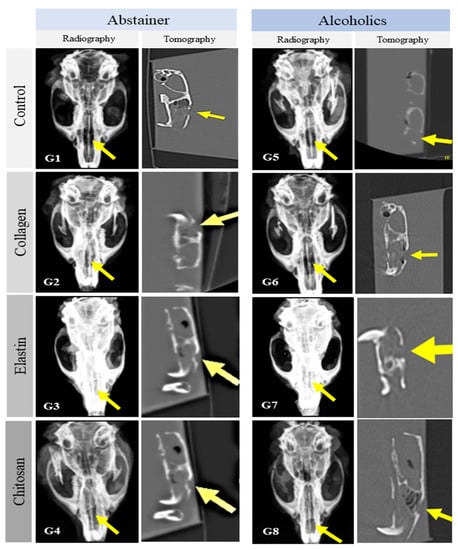 Radiographic and tomographic findings in the surgical area. The bone defect (yellow arrows) was not completely closed in any of the studied groups, and no bone deformity was observed. Abstainer animals (Ab): G1—control/abstainer (C/Ab), G2—collagen/abstainer (Co/Ab), G3—elastin/abstainer (El/Ab), and G4—chitosan/abstainer (Ch/Ab). Alcoholic animals (Al): G5—control/alcoholic (C/Al), G6—collagen/alcoholic (Co/Al), G7—elastin/alcoholic (El/Al), and G8—chitosan/alcoholic (Ch/Al).