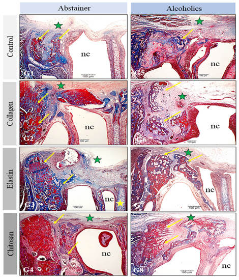 Regenerative medicine aims to replace or repair organs through the administration of cells with regenerative and immunomodulatory properties. The use of biomaterials consisting of extracellular protein polymers is therefore advantageous because they have inherently desirable features for tissue regeneration, such as supporting cell activity and biodegradability [,]. Within this context, to obtain data on the effectiveness and mechanisms of these membranes and to identify perspectives for their clinical use in tissue engineering, the aim of this study was to analyze the osteoregenerative potential of natural collagen, elastin, and chitosan polymers applied to nasal bone defects of rats submitted or not to experimental alcoholism.
