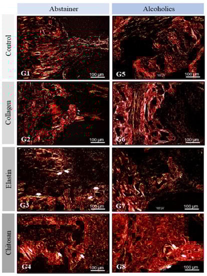 Based on the morphological images of Picrosirius Red, three levels of birefringence brightness intensity were revealed (red, green, and yellow), indicating a spatial organization with a slight difference in heterogeneity between the experimental groups. However, the images of abstainer groups (G1–G4) allowed us to observe that they were more intense in relation to alcoholics (G5–G8).