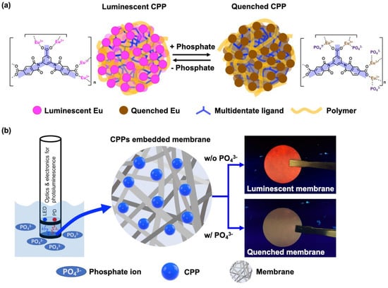 (a) Schematic illustration of the luminescent “turn-off” sensing based on CPP for detection of phosphate. (b) Conceptual configuration of phosphate sensor composed of light source, detector, and membrane containing CPPs as sensing materials.