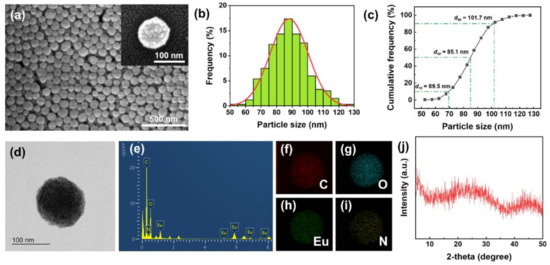 (a) SEM images, (b) size histogram, (c) cumulative frequency distribution, (d) TEM image, (e) EDX spectrum, (f–i) EDX elemental mapping, and (j) XRD spectrum of Eu-TCA.