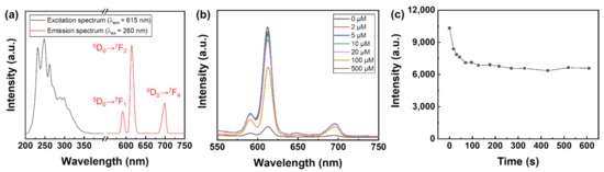 Figure 3a shows the excitation and emission spectra of the Eu-TCA dispersion in deionized water (200 mg/L). The excitation spectrum was measured at an emission wavelength of 615 nm, and the emission spectrum was determined under excitation at 260 nm. The broad band in the range of 230–300 nm in the excitation spectrum results from the O2− → Eu3+ charge transfer and π–π* electronic transition in coordinated organic ligands [30,31,32]. As shown in Figure 3a and Supplementary Figure S3, the emission spectra exhibit five characteristic transitions of Eu3+ centered at 579, 591, 615, 651, and 699 nm, corresponding to the 5D0 → 7FJ transitions (J = 0, 1, 2, 3, and 4), respectively [33].