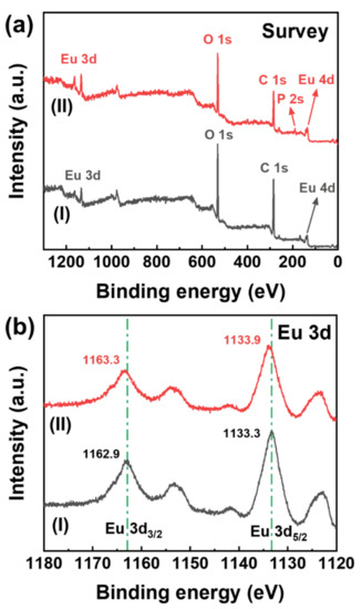 XPS spectra of Eu-TCA: (a) survey spectra of Eu-TCA before (I) and after (II) incubation with phosphate. (b) Eu 3d XPS spectra before (I) and after (II) incubation with phosphate.