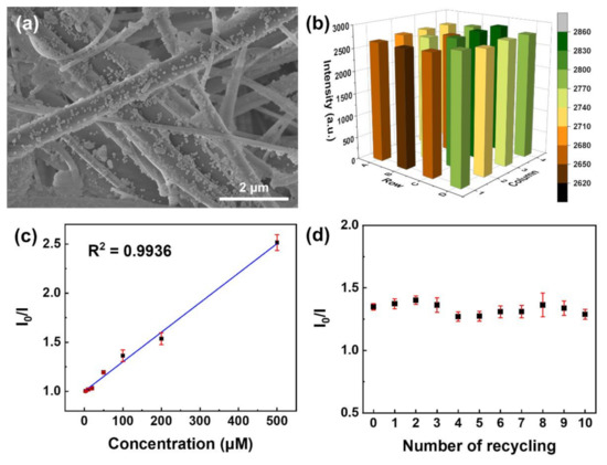 (a) SEM image of Eu-TCA/GMF. (b) Luminescence intensity of 4 × 4 wells of microplate containing the independently fabricated Eu-TCA/GMFs. (c) Stern–Volmer plot of the luminescence quenching of Eu-TCA/GMF (n = 7) as a function of phosphate concentration. (d) The luminescence intensity of Eu-TCA/GMF (n = 7) after ten runs of recycling. The concentration of phosphate is 100 μM.