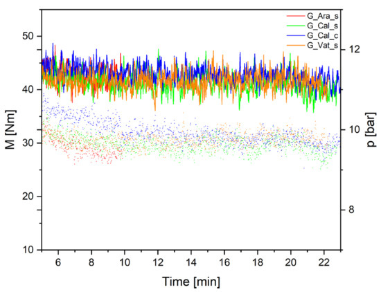 The progress of torque force (M [Nm]) and head pressure (p [bar]) during the extrudation of granulates is depicted in Figure 3. Constant values of torque over time (between 40–45 Nm) were recorded together with a slight decrease of the head pressure that oscillated between 7–10 bar after 10 min was reached. The G_Cal_c sample showed higher pressure values at the beginning of the processing in comparison with other samples. Such phenomena could be ascribed to the high specific surface area of applied commercial calcite particles, which may have had an increased tendency to partial agglomeration, nonetheless, after 11 min, pressure values started to be identical with the other samples. Thus, it can be assumed that suitable production conditions were achieved, and the Lumicene MR60MC2 PPR doped with the produced CaCO3 particles was successfully processed during extrusion.