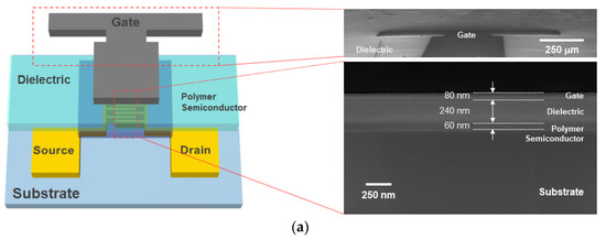Top-gate, bottom-contact PFETs were fabricated, as shown in Figure 1a. A chemically cleaned soda-lime glass (Corning EAGLE Glass) was used as a substrate, and Ti (5 nm)/Au (35 nm) was thermally evaporated onto the substrate and patterned using conventional lift-off methods for source/drain electrodes. The channel width and length of PFETs were 1000 and 20 μm, respectively. The conjugated semiconducting copolymers (i.e., CDT-BTz (Mw (~60,000) with a polydispersity index (PDI) of 2.5), CDT-FBTz (Mw (~75,000) with a PDI of 2.5), and CDT-PTz (Mw (~60,000) with a PDI of 2.5)) were purchased from ONE-Materials Inc. (Dorval, QC, Canada) and used as received. The chemical structures of the CDT-based D-A-type copolymers are shown in Figure 1c. To fabricate the thin-film coatings, the semiconducting polymer solutions dissolved in chloroform at a concentration of 10 mg/mL were deposited using bar coating, as shown in Figure 1c, and subsequently thermally annealed at 200 °C for 60 min in nitrogen ambient, resulting in a 60-nm-thick semiconducting polymer film. Next, for the top-gate dielectric, PMMA (dissolved in n-butyl acetate at a concentration of 80 mg/mL) was spin-coated and cured at 80 °C for 60 min. The thickness of the PMMA was measured to be 240 nm, and its geometric capacitance was 6.86 nF cm−2 at 1 kHz. Finally, the top-gate electrode was formed by thermally evaporating an 80-nm-thick layer of Al through a shadow mask. The film thicknesses were confirmed using Field Emission Scanning Electron Microscope (FE-SEM) (MIRA 3, TESCAN).