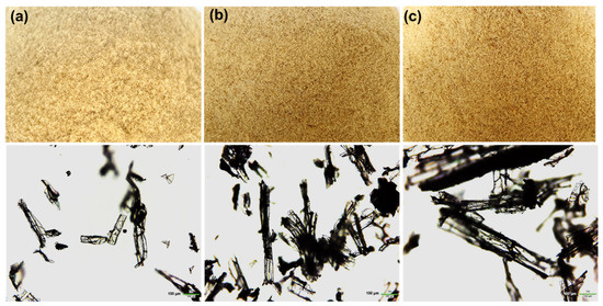 Physical appearances (upper) and optical microscope images (lower) of WHF with different mesh size—(a) 80 mesh, (b) 40 mesh and (c) 20 mesh, respectively.