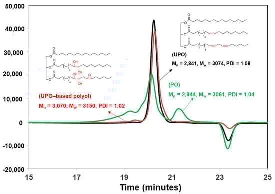 Furthermore, the molecular weight of the UPO and UPO-based polyol was measured using the SEC method. The SEC result is presented in Figure 3. It was found that the molecular weight of polyol-based UPO is higher than that of UPO. Because of the breakage of a double bond to produce OH functional groups on the polyol structure, the Mn value rose from 2841 to 3073 g/mol. The polydispersity index (PDI) dropped from 1.08 to 1.02. Furthermore, the FTIR and 1H-NMR methods were used to validate the chemical structures and functional groups of the UPO and UPO-based polyol.