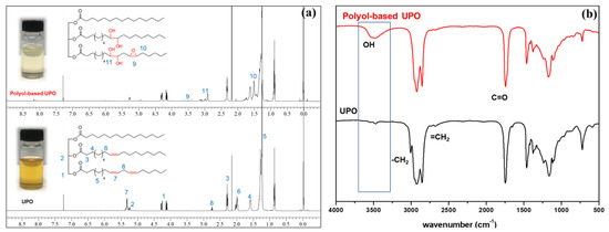 (a) 1H−NMR spectra and (b) FTIR spectra of UPO and polyol−based UPO.