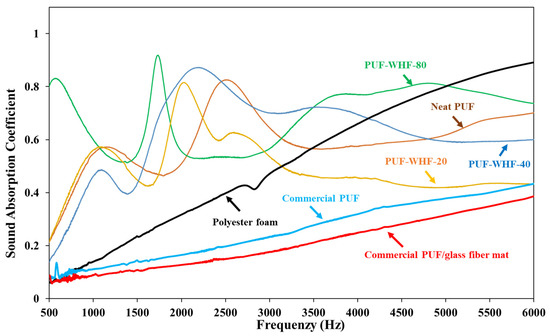 In comparison, the commercial PUF and PUF/glass fiber had SACs of 0.4, whereas the polyester foam approached 0.85 in the high frequency range. The prepared PUF composites are therefore superior sound-absorbing materials compared to the commercial ones, based on the efficiency of the SAC findings. Furthermore, PUF-WHF-80 was a suitable sound-absorbing material derived from bio-mass with a high potential for sound absorption and is a prospective option for industrial green manufacturing, with the highest SAC value of 0.92.