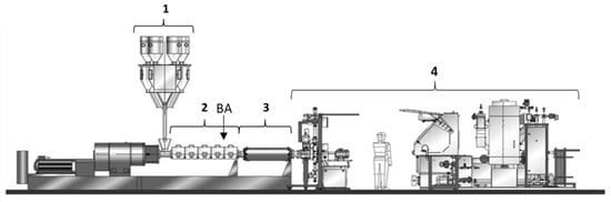 Depending on the application, polymer granulate—virgin and/or recycled—can be used as the main feedstock (i.e., the part 1 in the Figure 1). Solid feed materials and additives are dosed separately by gravimetric feeders into the twin screw extruder (part 2 in Figure 1); the dispersion of the additives in the melt is controlled by the screw design and various operating parameters. The blowing agent is injected directly into the extruder via an injection valve (the exact position is pointed out by the arrow in Figure 1) and, under those conditions, the supercritical state is reached for CO2 []. The extruder has heating elements and water cooling, to maintain a constant and even temperature distribution throughout the housings and the melt.
