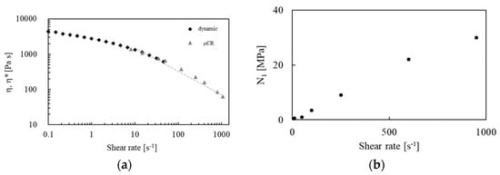 (a) Complex and shear viscosity as function of shear rate measured by dynamic (black rhombus) and capillary rheometer (grey triangles), the dashed line is the power law fitting; (b) normal stresses (N1) as function of shear rate.